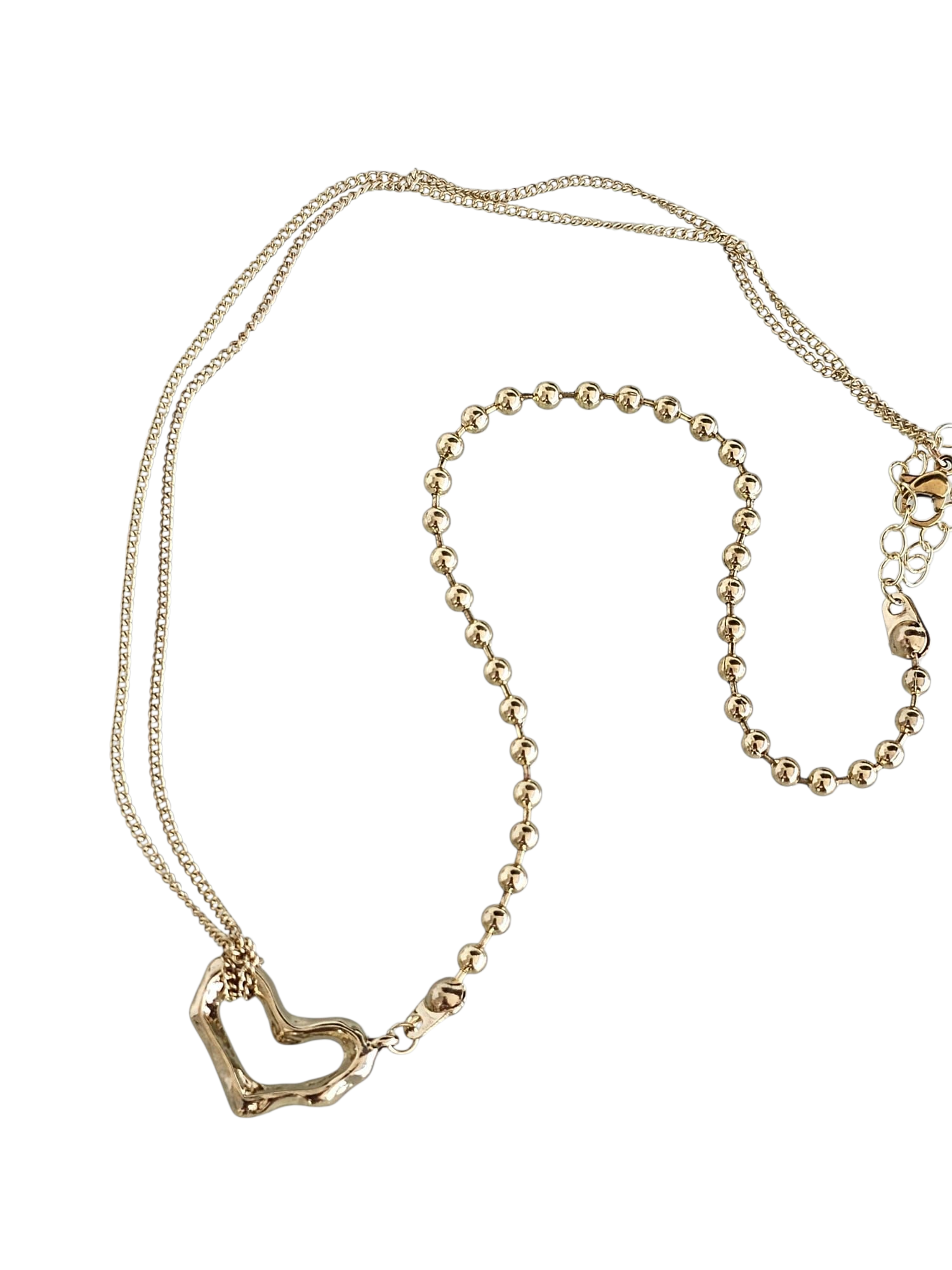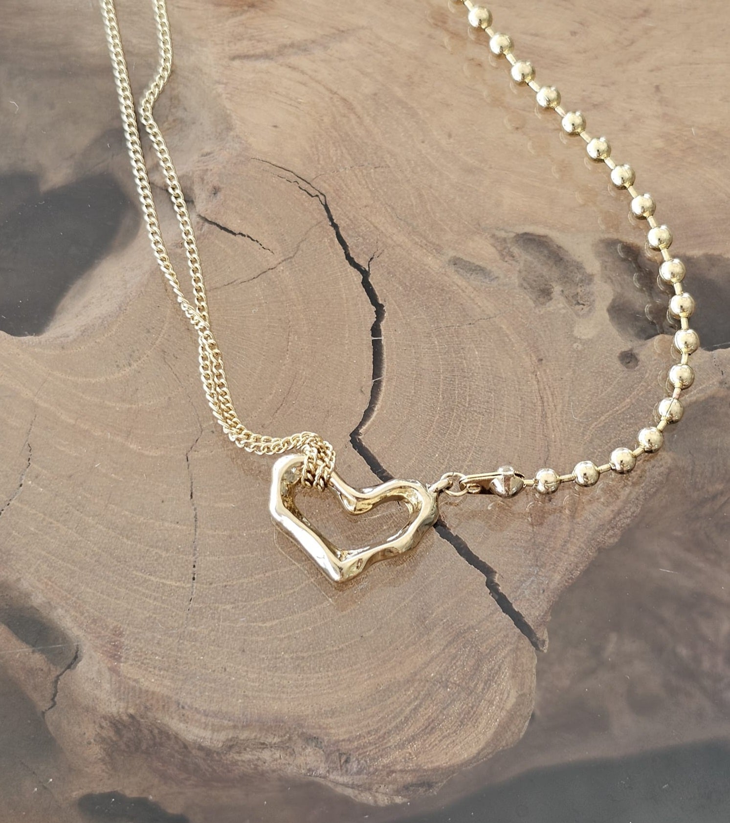 The Open Heart Link Necklace features a combination of fine and beaded chain styles, highlighted by a textured open-heart pendant. Expertly fashioned from durable stainless steel, this elegant collarbone necklace offers exceptional strength and resistance to wear. Its 18k gold plating provides a luxurious finish that resists fading, preserving its radiant look over time. Designed to rest gracefully along the collarbone, it adds a refined elegance to any ensemble, marrying enduring quality with sophisticated style for everyday wear.
