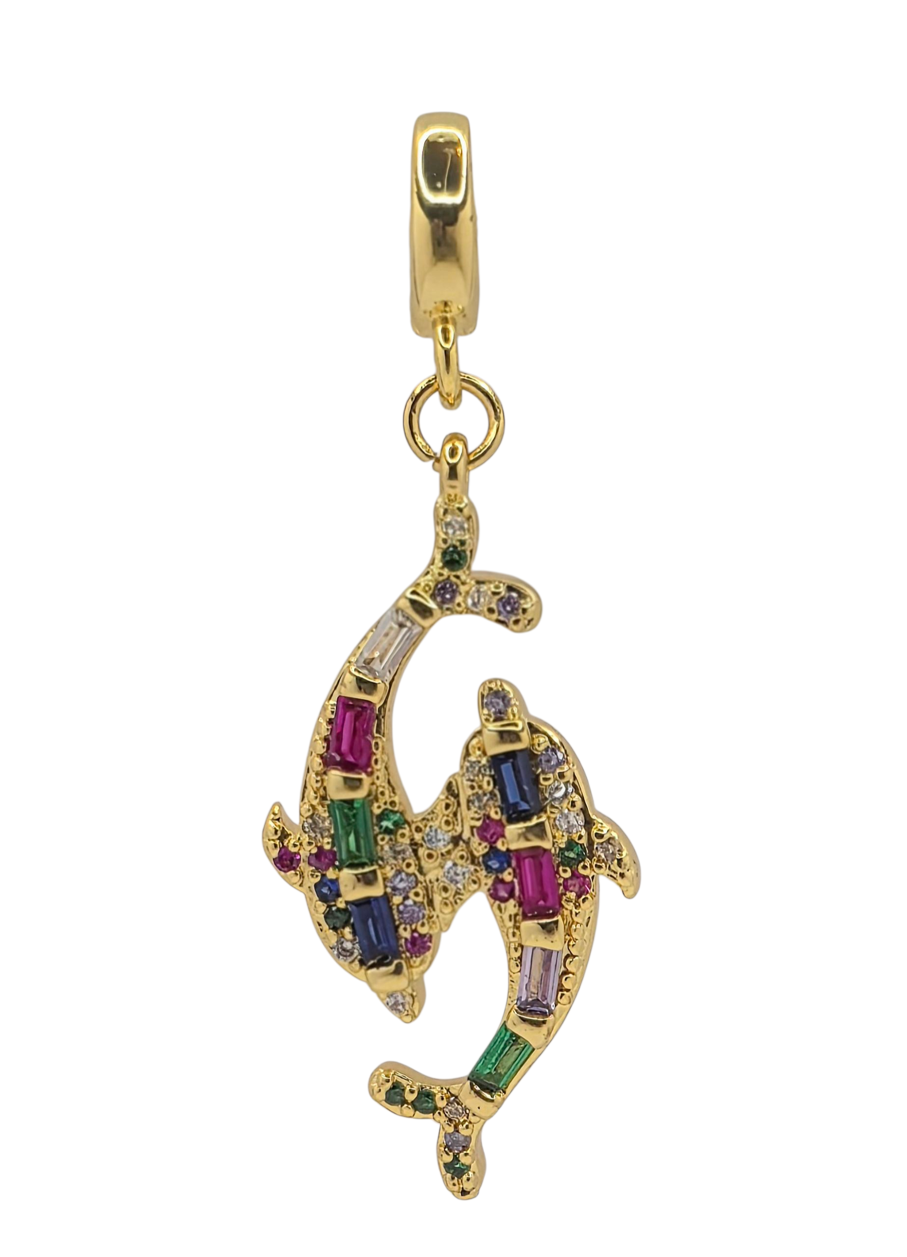This 18k gold-plated charm pendant offers a refined base for a custom necklace. Featuring the "Gemstone Dolphins" design, it showcases two intertwined dolphins adorned with vibrant gemstones, inviting you to personalize your piece by adding your own charms and elements for a distinctive, elegant creation.